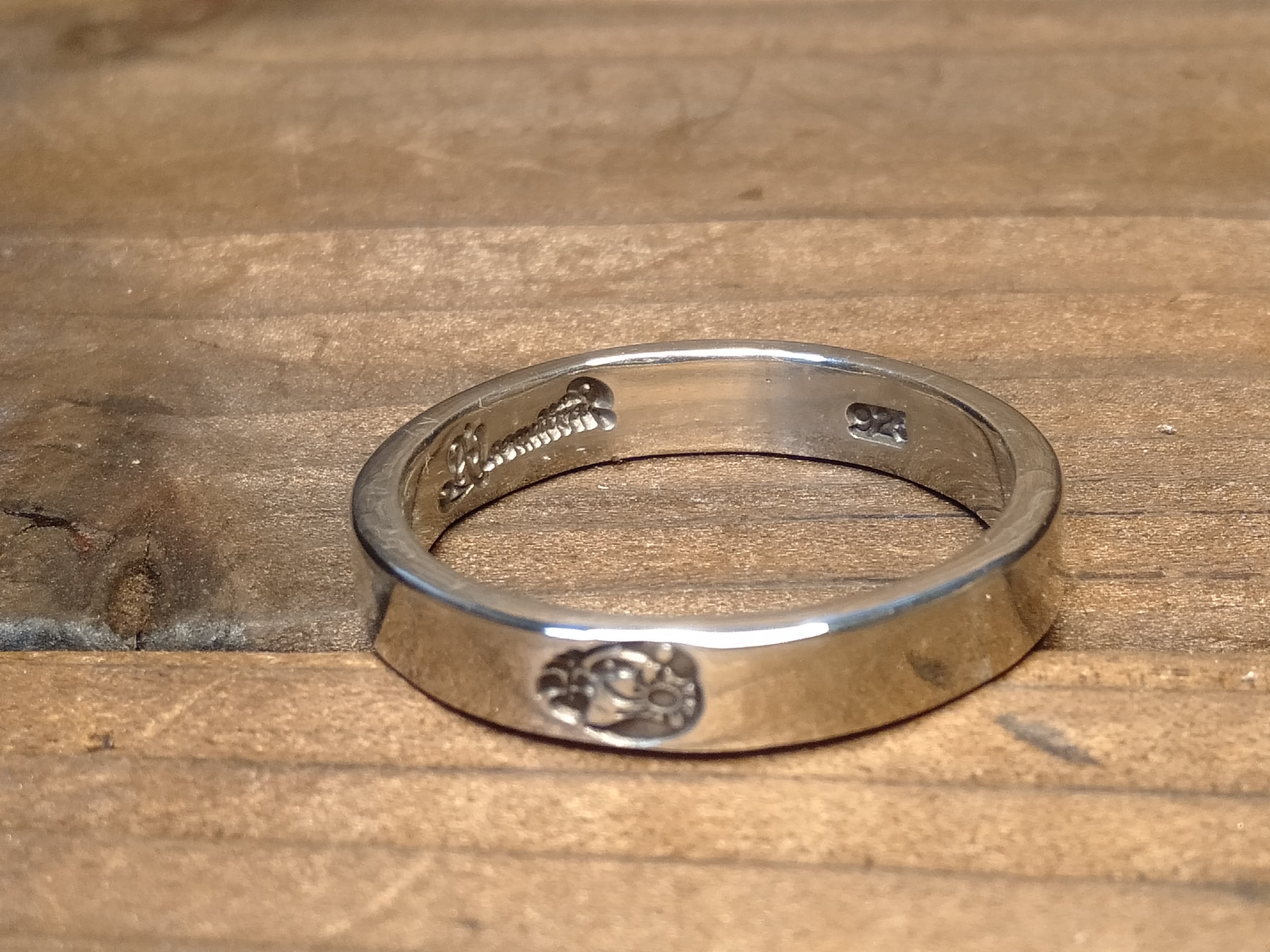 ブランドロゴマークを力強く打ち込んだ平打ちリング。