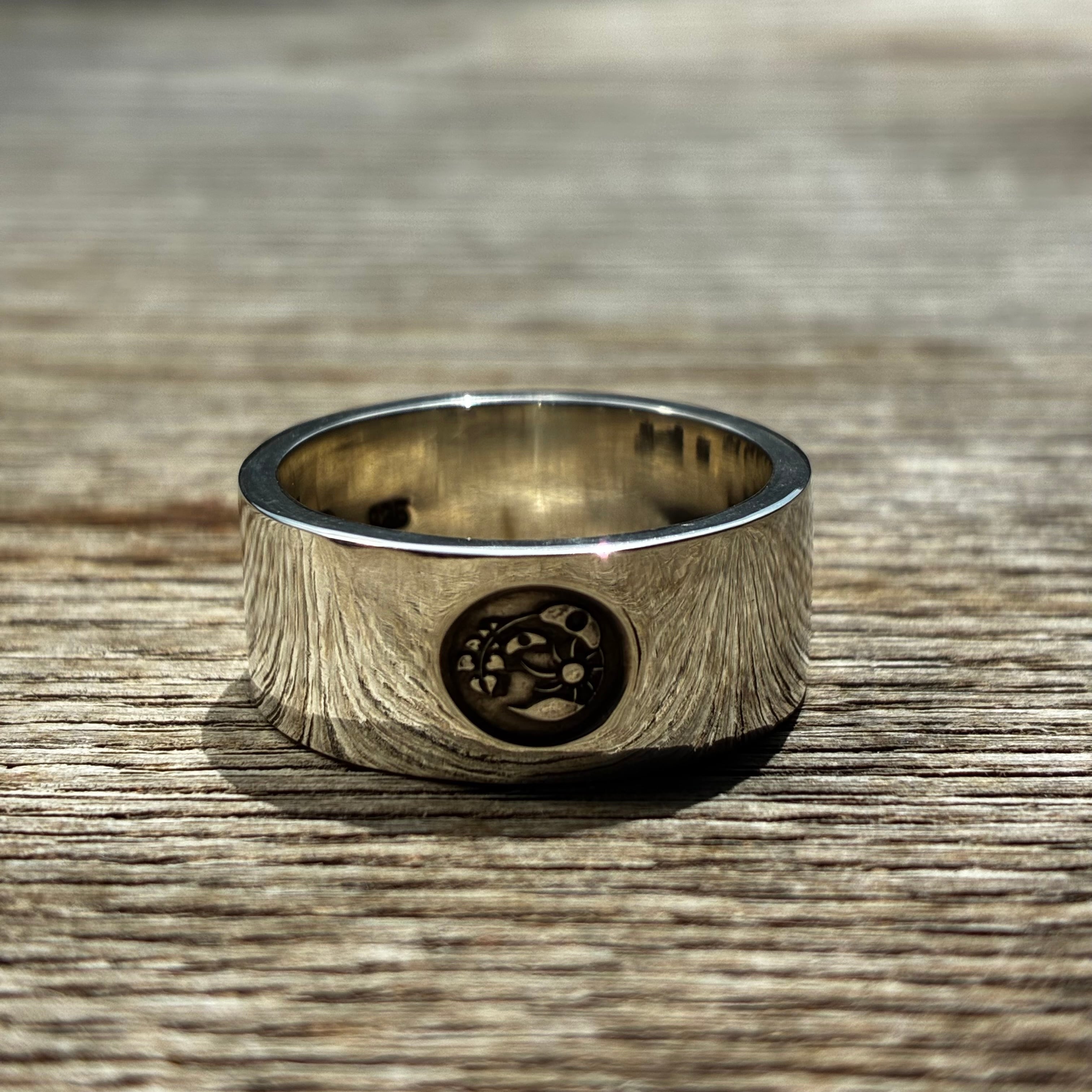 ブランドロゴマークを力強く打ち込んだ平打ちリング。